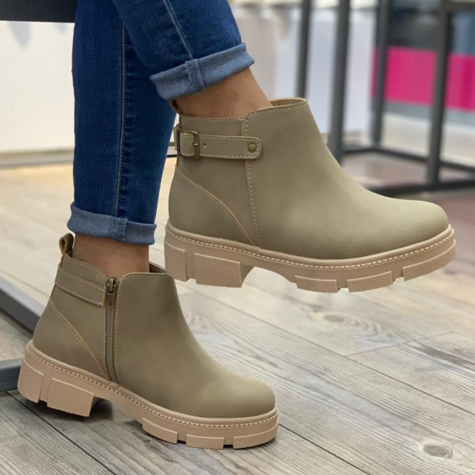 Conquista el asfalto con el Botín Suela Tractor. Su diseño robusto con correa trasera y cierre lateral ofrece un ajuste seguro y un estilo urbano inconfundible. Ideal para la mujer que busca aventura y moda, con la garantía de nuestra fabricación nacional. ¡Comodidad y personalidad en cada paso! 🌲