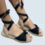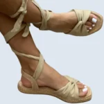 Abraza la frescura y la moda con la Sandalia Plana Yute Entrelazada. Su capellada suave y tejida se complementa con tiras de amarrar que envuelven tus tobillos, ofreciendo un toque chic y delicado. Ideal para la mujer que busca un calzado ligero, versátil y de fabricación nacional para sus días más cálidos. ¡Camina con encanto natural y total libertad! 🌸